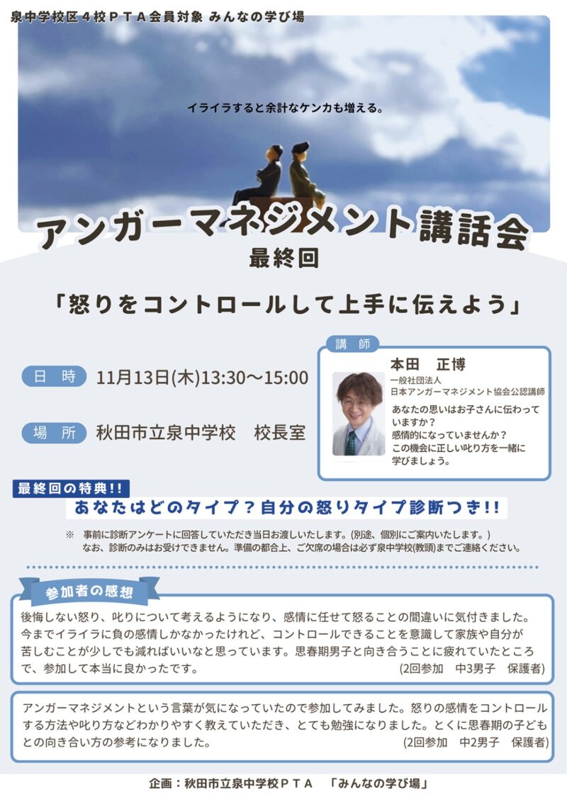 秋田市立泉中学校PTAにてアンガーマネジメント講話会でした。